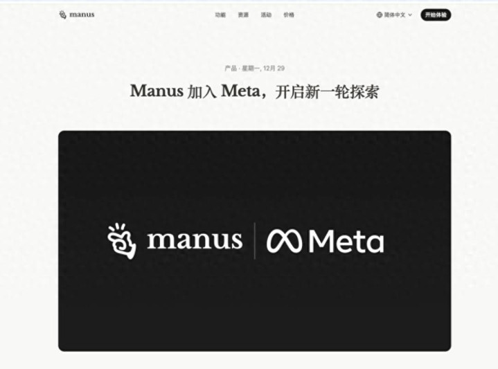 12月30日,Manus在官网发布消息称,“Manus即将加入Meta”,同时Manus将继续通过App和网站为用户提供产品和订阅服务,并继续在新加坡运营。据晚点,此次Meta收购金额达数十亿美元。