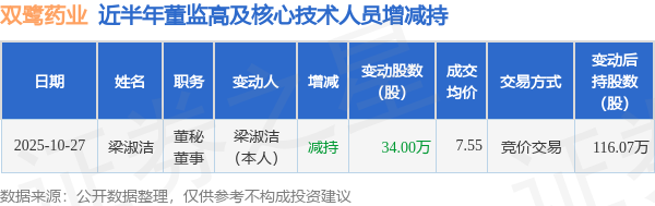 证券之星消息,根据10月28日市场公开信息、上市公司公告及交易所披露数据整理,双鹭药业(002038)最新董监高及相关人员股份变动情况:2025年10月27日公司董秘,董事梁淑洁共减持公司股份34.0万股,占公司总股本为0.0331%。变动期间公司股价上涨0.27%,10月27日当日收盘报7.53元。